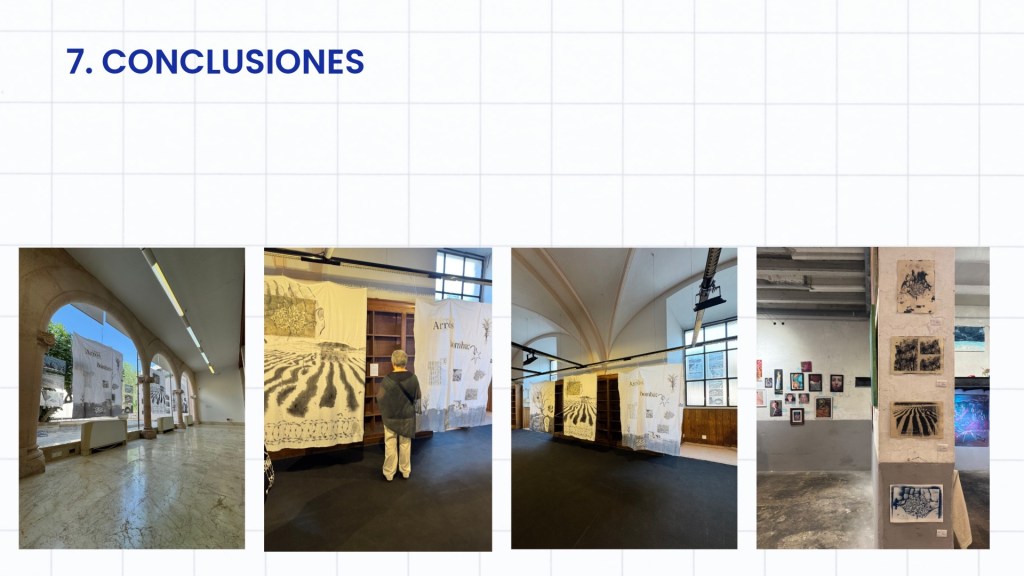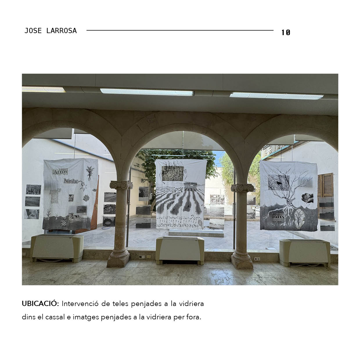 La intervención en la vidriera juega con el espacio de tal manera que, desde el patio, se observan las primeras imágenes que fotografié como parte de una serie documental de momentos clave de la vida agraria y su relación con la tierra. Mientras que, al entrar, pueden verse las telas en las que he trabajado durante el proceso. Estas muestran cómo el abandono progresivo del sector primario afecta tanto la sostenibilidad como la identidad cultural.