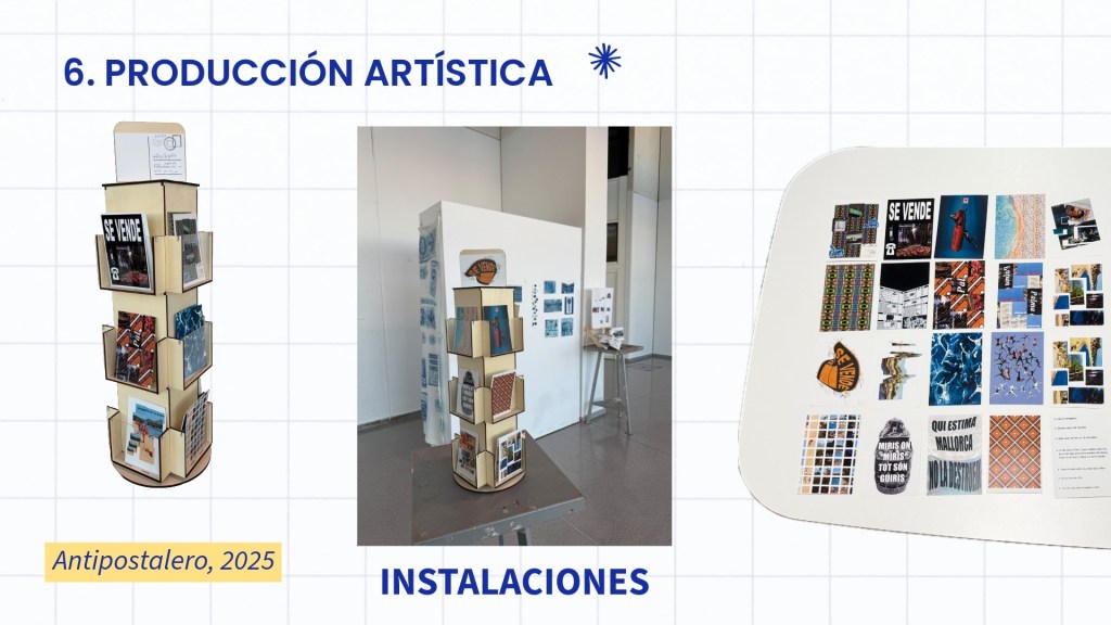Mi Trabajo Final de Grado explora cómo la masificación turística ha alterado el espacio urbano en Baleares, generando una reflexión crítica sobre la pérdida de identidad local. Se trata de un trabajo teórico-práctico que utiliza las imágenes de archivos para crear una producción artística que aborda problemas como la gentrificación, el encarecimiento de la vivienda y la desaparición de tradiciones. A través de la experimentación con diversos materiales y formatos artísticos multidisciplinares, se propone un enfoque sostenible